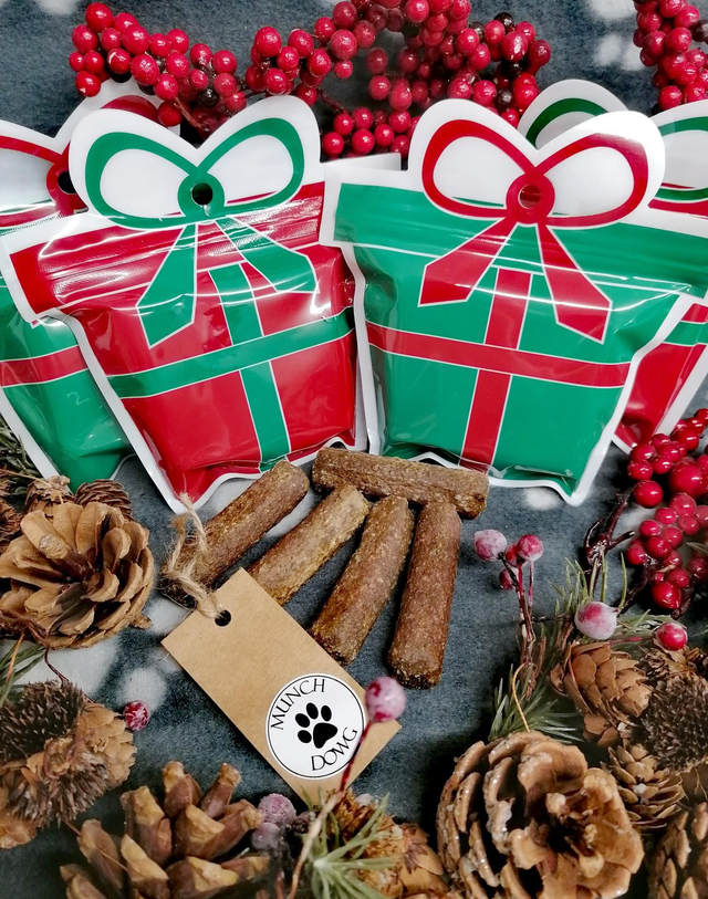 Super cute present shaped gift bags filled with sausages (contain chicken & beef).