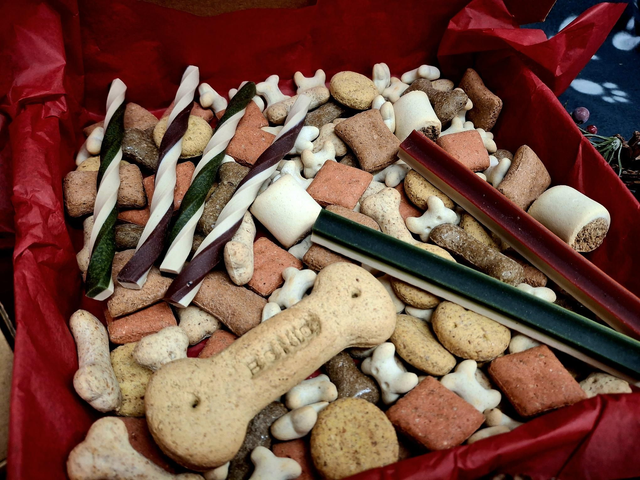 A yummy selection of biscuits and veg sticks packaged in a Santa Paws delivery box*
